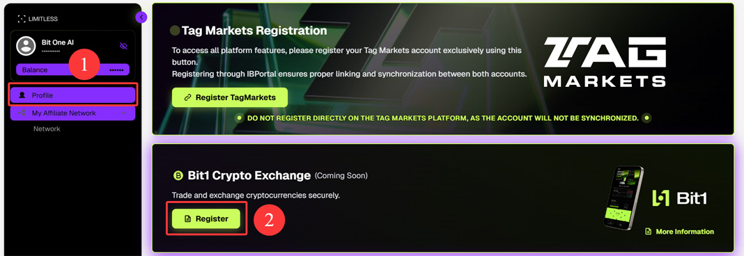 Bit1 is an invitation-only crypto exchange. Endotech is Bit1 Exchange’s first technology partner, providing Bit1 users with automated/copy trading services. Join Limitless IB Portal for free, granting you access to intelligent trading tools such as Endotech AI trading, Bit1 copy trading, and Tag Markets copy trading. Funds are solely under your control on the exchange, with anytime capital return, no lock-up period, and no penalties. A rewards program is in place: 60% of trading fees and 15% of trading profits go back to the community. The IB Affiliate program offers generous and permanent benefits! If you are unable to register, you need to enable a VPN. Registration may be slow; please wait for the Cloudflare verification code to appear before submitting your registration information. Join Link: